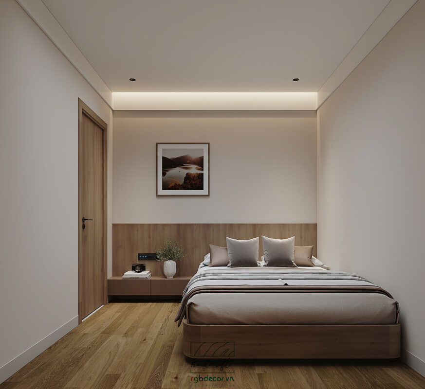 Phòng ngủ là nơi nghỉ ngơi nên được ưu tiên sự thoải mái và thư giãn. Các chi tiết như giường gỗ tự nhiên, ánh sáng đèn led âm trần, tranh treo tường nghệ thuật và cửa sổ lớn giúp không gian nhẹ nhàng, dễ chịu. Ngoài ra, bàn làm việc nhỏ được bố trí sát cửa sổ – tận dụng ánh sáng tự nhiên tối đa cho công việc hoặc học tập.