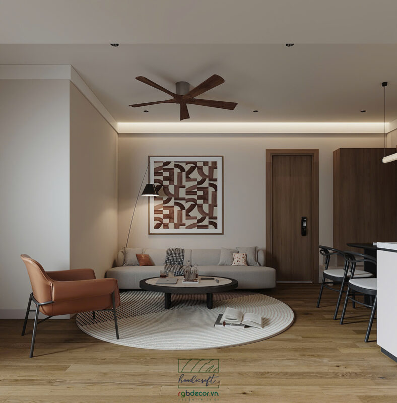 Hình ảnh căn hộ trong bài là minh chứng cho phong cách thiết kế nội thất hiện đại, tối giản nhưng đầy tiện nghi. Sử dụng gam màu trung tính như trắng, be, nâu gỗ kết hợp ánh sáng tự nhiên và đèn hắt trần giúp không gian trở nên rộng rãi, ấm cúng hơn.